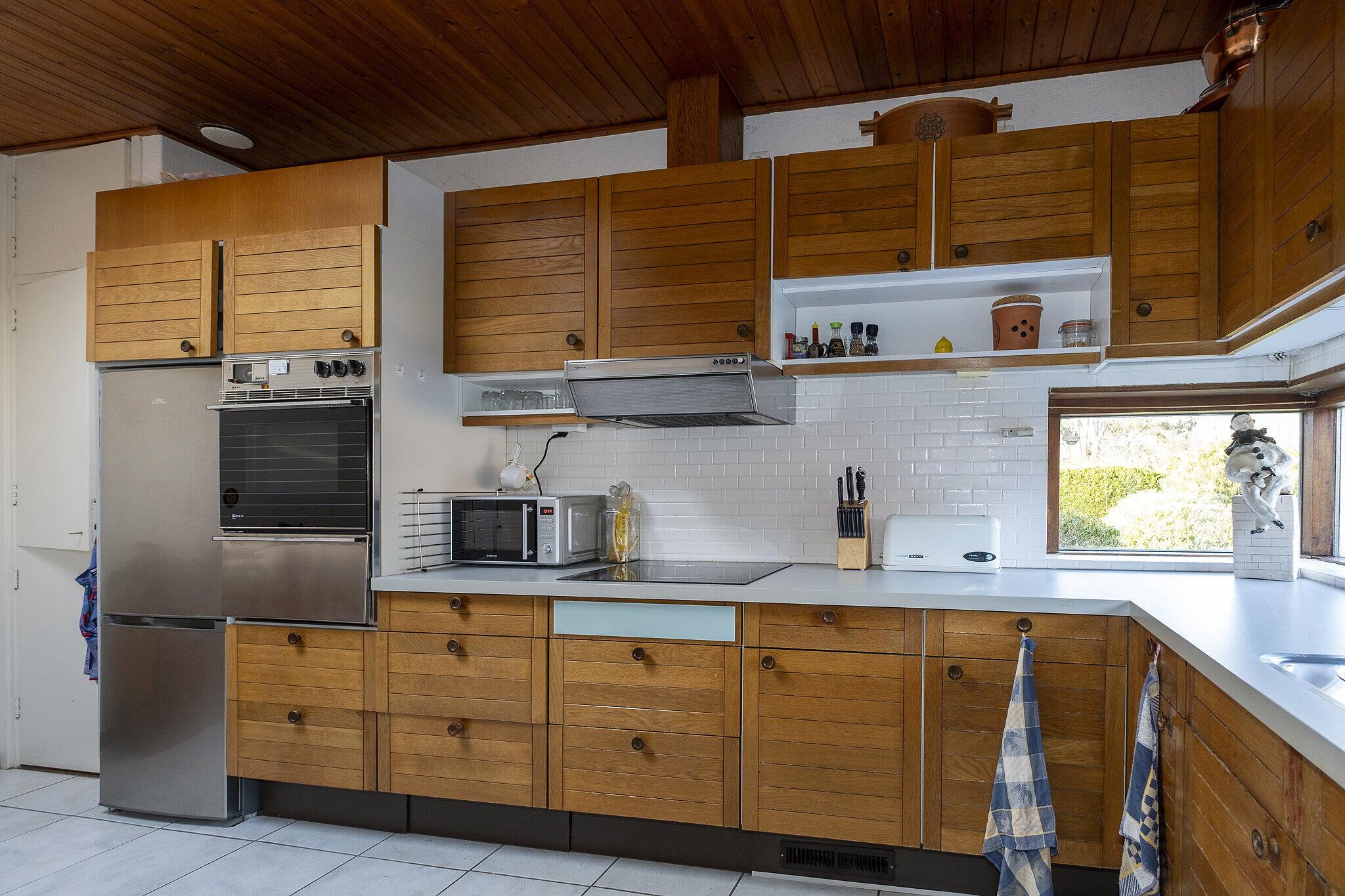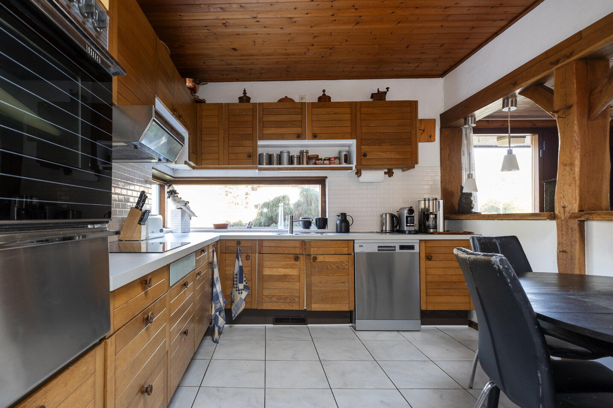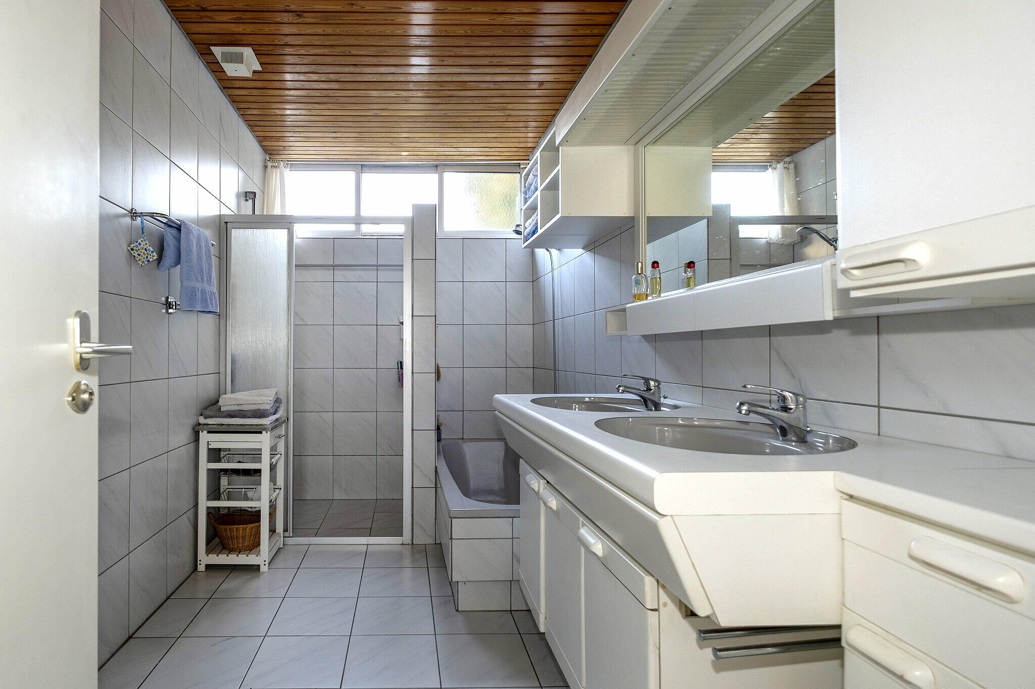 De dichte keuken is praktisch ingericht en biedt voldoende werk- en kastruimte. De woning beschikt over vier slaapkamers (ca. 16, 10, 10 en 10m2), waarvan één slaapkamer is voorzien van een kleine badkamer met wastafel en douche. De tweede badkamer is voorzien van een ligbad, douche en een dubbele wastafel.