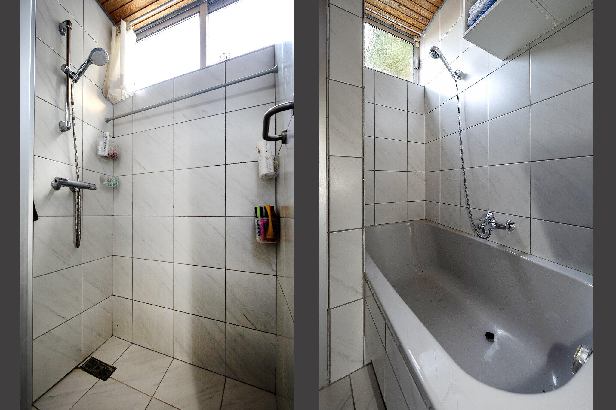 - Ligbad, toilet, douche, dubbele wastafel, wastafelmeubel douche, wastafel